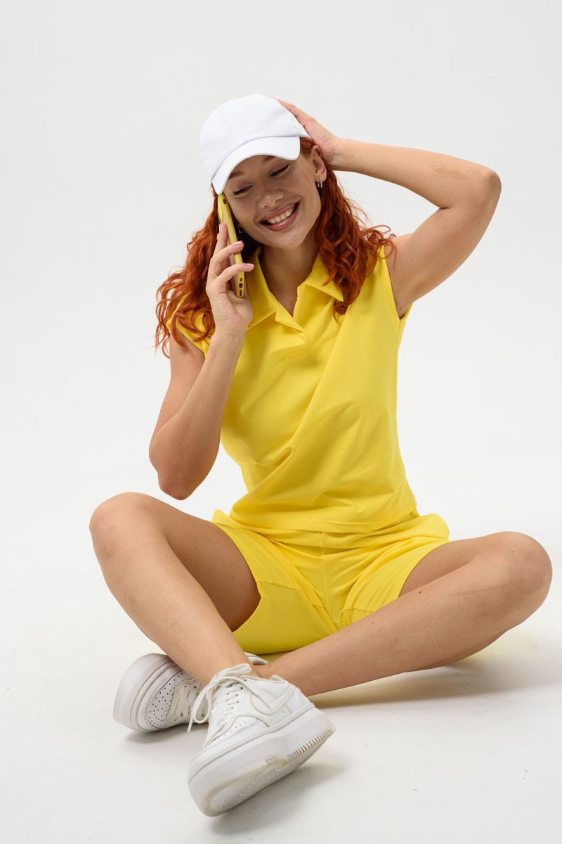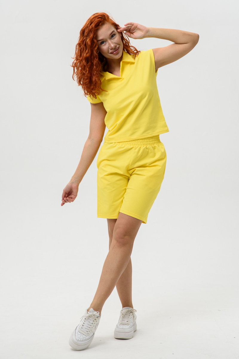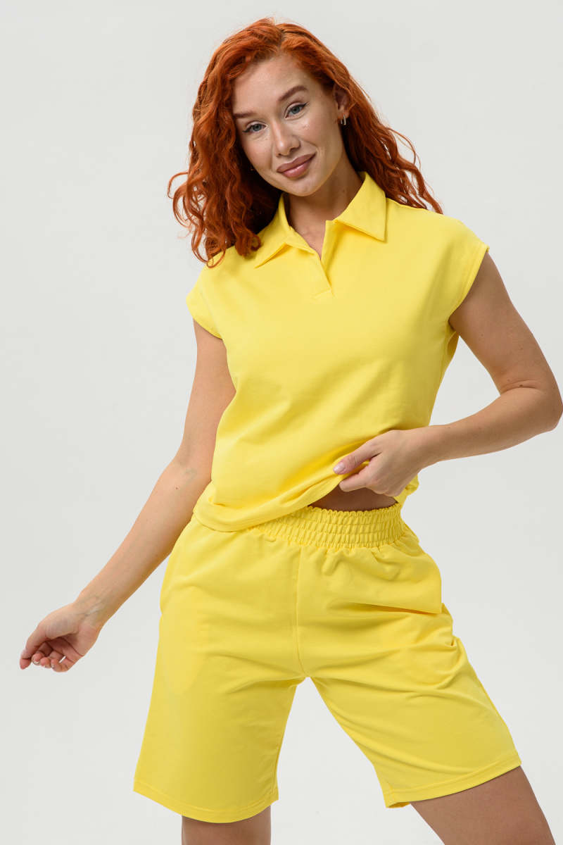 Летний костюм - жилет и шорты. Жилет с воротником "поло" с цельнокроенными подбортами и отстрочкой до линии плеча. Лёгкий лаконичный полуприлегающий жилет со спущенной линией плеча мягко драпируется на линии талии. Шорты с высокой посадкой, пояс прошит на поясной машине. В боковых швах внутренние карманы. Этот стильный костюм подходит для путешествий, прогулок, повседневного использования.