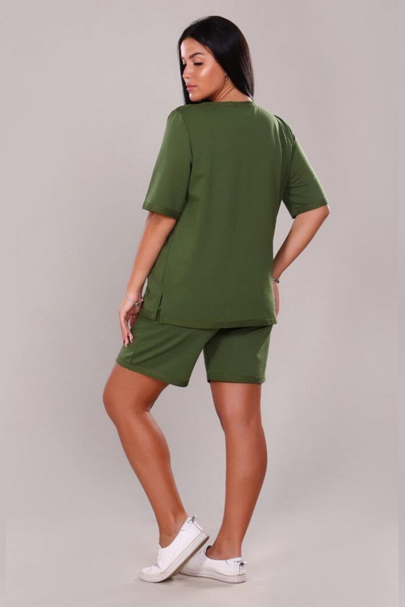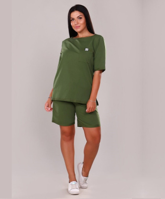 Женский костюм состоит из футболки и шорт, выполнен из мягкого и приятного на ощупь материала футер 2-х нитка. В состав входят 70% хлопка, 24% полиэстера и 6% эластана, что обеспечивает комфорт и хорошую посадку.